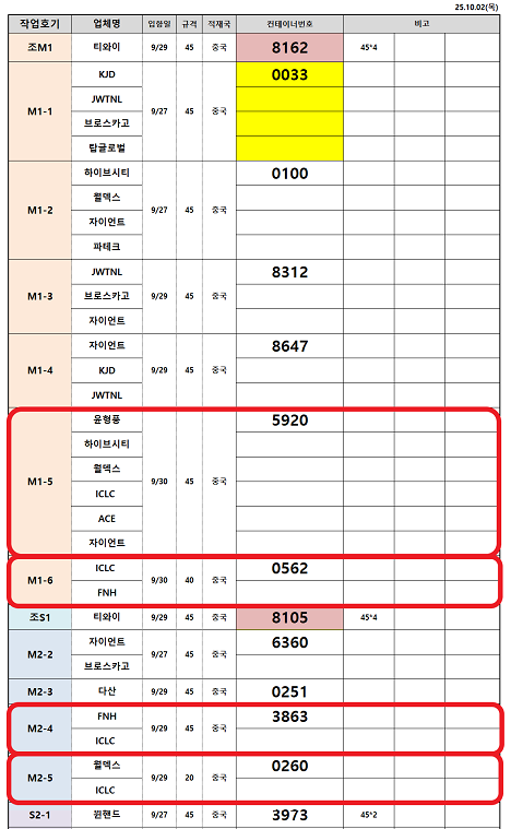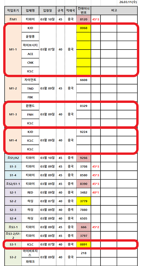 중국 출고일 | 한국 입항일 | 입항 지역 | 통관 작업 일정 |