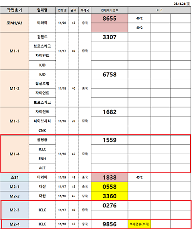 해운 | 인천 | 11.17(월), 18(화) 입항건 통관 작업 예정 | 11.16(일), 17(월) 중국 출고 | - |
