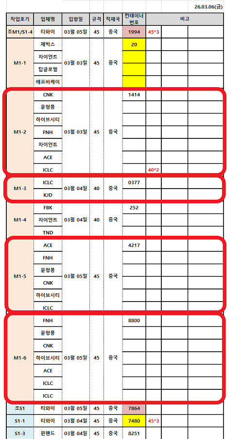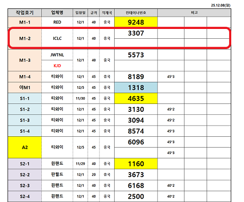 1. 중국 물류센터 출고 일정 및 한국 입항 일정