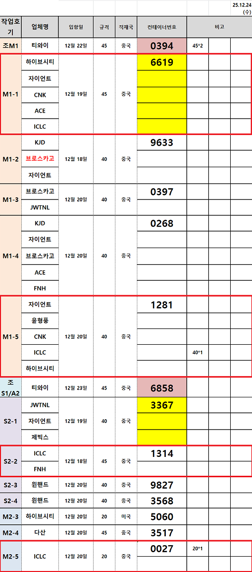 12.17(수) | 12.18(목) | 인천 | 12.24(수) 통관 작업 예정 |