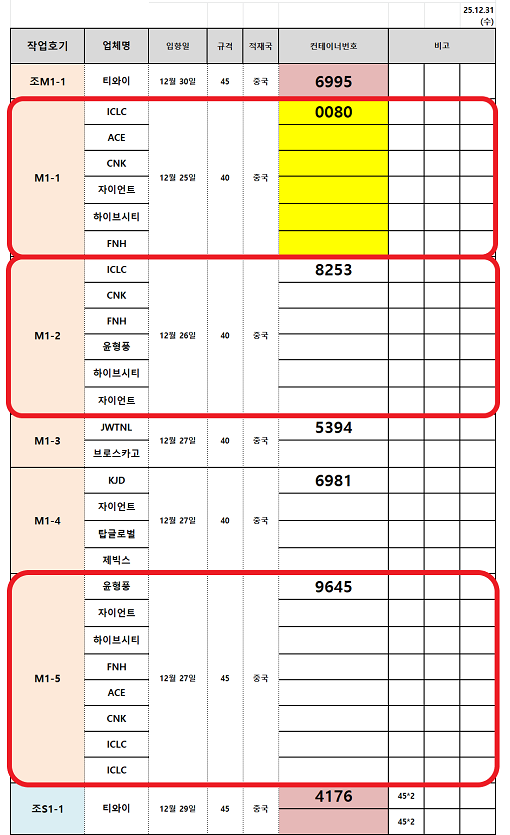 12.25(목) | 12.26(금) | 인천 | 12.31(수) 통관 작업 예정 |