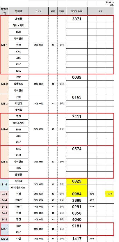 해운 | 인천 | 1.16(금) 입항건 통관 작업 예정 | 1.14(수), 15(목) 중국 출고 | - |