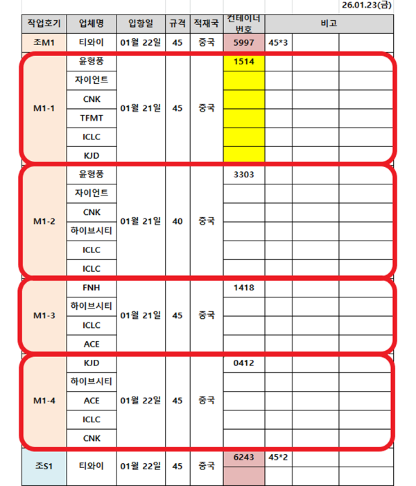 해운 | 인천 | 1.21(수), 22(목) 입항건 통관 작업 예정 | 1.20(화), 21(수) 중국 출고 | - |