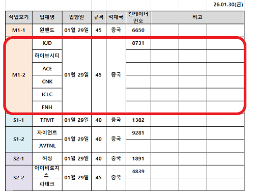 1.28(수) | 1.29(목) | 인천 | 1.30(금) 통관 작업 예정 |