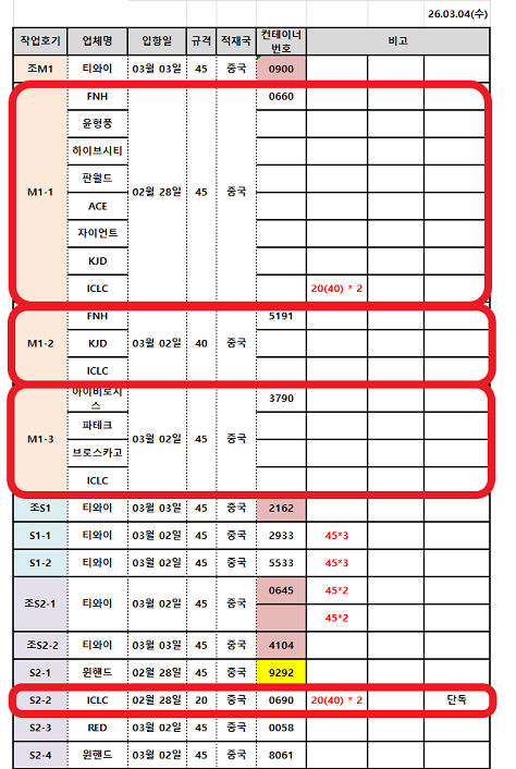해운 | 인천 | 3.4(수), 5(목) 입항건 통관 작업 예정 | 3.3(화), 4(수) 중국 출고 | - |