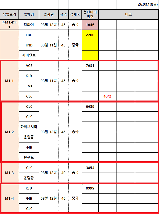 3.10(화) | 3.11(수) | 인천 | 3.13(금) 통관 작업 예정 |